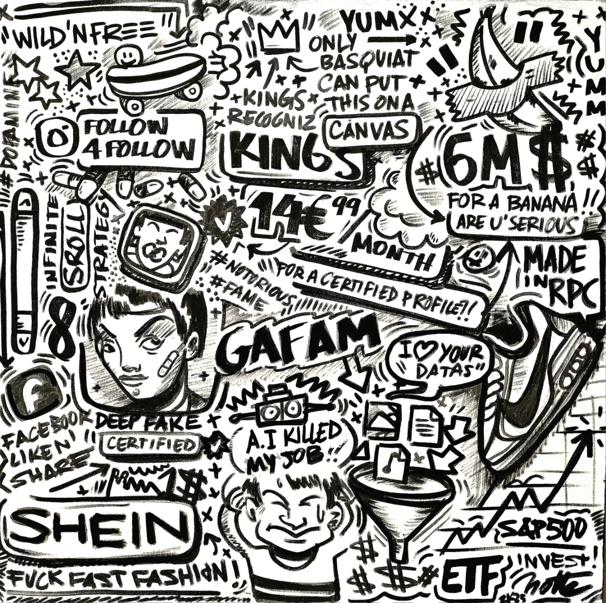 L’utilisation du marqueur sur toile est centrale dans le processus créatif de Notte. Ses dessins en doodle art, bien que spontanés, dissimulent une réflexion profonde sur notre époque, tout en capturant l’énergie du moment à travers des compositions riches en détails.